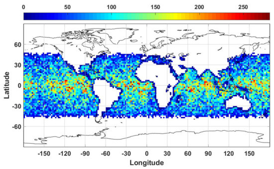 Global collocation distribution (number of collocations in 2° × 2° grid) between COSMIC-2 RO and SNPP ATMS measurements over the ocean.