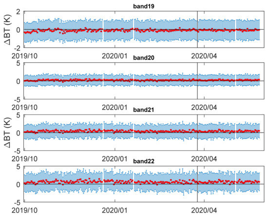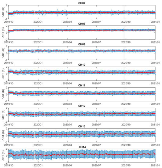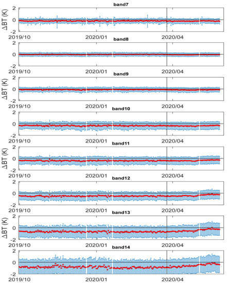 Figure 4 and Figure 5 show the BT bias (ΔBTWETPf2) trending between BTCOSMIC-2,WETPf2, and SNPP ATMS measurements for ATMS CH07–14 and CH19–22, respectively. The change of ΔBTWETPf2 after 15 October 2019, can be identified due to the calibration update of SNPP ATMS on 15 October 2019. Major SNPP ATMS calibration updates were implementations of antenna reflector emission correction algorithm update and antenna pattern correction coefficients update on 15 October 2019. The step changes in Figure 4 and Figure 5 indicate that the COSMIC-2 data’s stability is sensitive enough to capture the calibration update of SNPP ATMS on 15 October 2019.