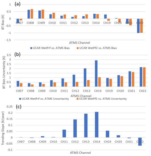 Summary of (a) mean BT bias μ(ΔBT) and (b) uncertainty σ(ΔBT) between CRTM-simulated BT with COSMIC-2 UCAR WETPrf or WETPf2 data as inputs and SNPP ATMS measurements for ATMS CH07–14 and CH19–22. (c) Derived trending slope D(ΔBTWETPf2) of CRTM-simulated COSMIC-2 WETPf2 data compared with ATMS measurements from 16 October 2019, to 20 September 2020.