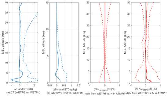 - Differences between UCAR COSMIC-2 WETPrf and WETPf2 can be identified through comparison with ATMS. This paper shows the mean biases between BT measurements of SNPP ATMS and CRTM-simulated BT from two versions of UCAR COSMIC-2 wet profiles, e.g., WETPf2 and WETPrf, are all within 0.4 K for ATMS CH07, CH10–14, CH19, and CH20 (see Figure 6 and Table 3). The COSMIC-2 vs. ATMS BT biases of ATMS CH19 and CH20 have an opposite sign between μ(ΔBTWETPrf) and μ(ΔBTWETPf2). The direct comparison between COSMIC-2 WETPf2 and WETPrf data shows distinct differences in both temperature and humidity for the height region below 7 km (Figure 7). Therefore, the differences between UCAR COSMIC-2 WETPrf and WETPf2 1DVAR retrieval algorithms cause differences in the retrieved temperature and humidity profiles identified in the COSMIC-2 vs. ATMS comparison. In terms of BT bias uncertainties of UCAR COSMIC-2 wet profile products, it is found that there are significant reductions in σ(ΔBTWETPf2) for ATMS CH07-14 in comparison with σ(ΔBTWETPrf). More than two times of reductions in σ(ΔBTWETPf2) for ATMS CH12–14 are observed. The substantial improvements in the σ(ΔBTWETPf2) can be attributed to the 1DVAR algorithm updates implemented for the UCAR WETPf2 1DVAR retrieval algorithm [53]. It is suggested that the a priori model used in the 1DVAR retrieval, such as GFS or ECMWF model that has assimilated ATMS data to a different extent, can directly impact the variation of σ(ΔBT).