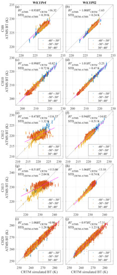 The six small satellites within the COSMIC-2 constellation maintain a 24-degree orbital inclination angle, and the latitude coverages of their RO measurements vary from the equator to mid-latitude. To study the latitude-dependent difference between CRTM-simulated BTs from UCAR WETPrf and WETPf2 data, we show the scatter plots of ATMS BT vs. BTWETPrf (left column) and ATMS BT vs. BTWETPf2 (right column), respectively, in Figure 8, for selected ATMS channels, e.g., CH08, CH10, CH12, CH13, and CH20. The data are grouped with color-coding into three latitudinal regions: −48° to −30°, −30° to 30°, and 30° to 48° in latitude. There are strong linear correlations for ATMS CH08, CH10, and CH20 compared to ATMS BT and CRTM-simulated BT for COSMIC-2 WETPrf and WETPt2 data. However, for ATMS CH12 and CH13, the correlations between ATMS BT and BTWETPrf (BT from COSMIC-2 WETPrf) in Figure 8e,g are much less linear (more scattered) in comparison with those shown in Figure 8f,h. As shown in Figure 8e,g, the ATMS BT vs. BTWETPrf comparisons over the latitude region −30° to 30° are much larger scattering than those over the southern and northern high latitude regions. The main reason for such difference is that the UCAR WETPf2 model is closer to the background model over height regions of ATMS CH12 and CH13 than the UCAR WETPrf model due to different weighting of the a priori model in the 1DVAR retrieval model construction.