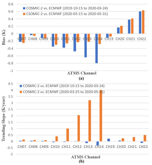 - O-B bias trending can help evaluate the impacts of assimilation of COSMIC-2 RO data into ECMWF. The trending of O-B biases between COSMIC-2 and ECMWF for ATMS channels quantitatively shows the impacts of the assimilation of COSMIC-2 RO data into ECMWF on 25 March 2020. It is shown that significant reduction in the absolute O-B BT biases for ATMS CH10 to CH14 and CH19 after assimilating COSMIC-2 data into ECMWF. For ATMS CH12–14, the reduction in O-B biases is more than half (Table 4 and Figure 14). After 25 March 2020, the decrease in O-B biases confirms that the assimilation of COSMIC-2 data into ECMWF has statistically significant positive impacts on the ECMWF reanalysis and improves consistency with the data from other observing systems, as shown in [52,66].