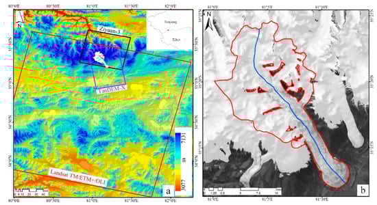 The geographic location of the study area. The coverages of the TanDEM-X, ZiYuan-3, and Landsat TM/ETM+/OLI data are shown as purple, black, and red triangles, respectively, in (a). The inset picture in (a) shows the general location of the Chongce Glacier, and the red area in the inset map indicates the position of the study area. The background in (b) is the Landsat ETM+ image acquired on 3 July 2002, with the red and blue lines respectively marking the outlines and the centerline of the Chongce Glacier, which were acquired from the Second Chinese Glacier Inventory [].