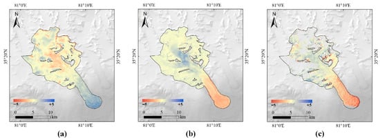 Observed surface elevation changes (m yr−1) over the Chongce Glacier during the periods of 1970–2000 (a), 2000–2012 (b), and 2012–2018 (c). Note that the coverage of the ZY-3 images (see Figure 1) resulted in the data missing in the southwest part (c).