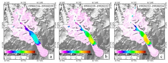Flow velocities (m yr−1) of the Chongce Glacier during the periods of 16 February 1990–19 February 1991 (a), 19 February 1991–22 February 1992 (b), and 22 February 1992–24 February 1993 (c).