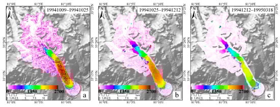 Flow velocities (m yr−1) of the Chongce Glacier during the periods of 9 October 1994–25 October 1994 (a), 25 October 1994–12 December 1994 (b), and 12 December 1994–18 March 1995 (c).