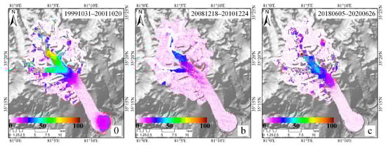 Flow velocities (m yr−1) of the Chongce Glacier during the periods of 31 October 1999–20 October 2001 (a), 18 December 2008–24 December 2010 (b), and 5 June 2018–26 June 2020 (c).