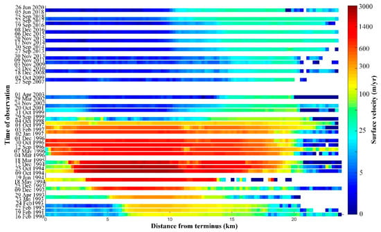 In order to further analyze the change of the glacier velocity, the evolution of the surface velocity along with the longitudinal profile of the Chongce Glacier (see Figure 1) from 1990 to 2020 is exhibited in Figure 6. In the early 1990s, the velocity accelerated slowly over the mid-stream area of the glacier, with an increase in velocity from 150 m yr−1 in 1990/1991 to 240 m yr−1 in 1992/1993. By December 1993, the velocity reached about 1000 m yr−1, which is about nine times more than the velocity in 1990/1991. The velocity then increased rapidly and reached a peak of 2500 m yr−1 during October to December in 1994. After this velocity peak, there was a significant deceleration, with the maximum velocity dropping to about 250 m yr−1 by 1997/1998, which represents a return to the velocity level seen in 1992/1993. This was followed by relatively low flow velocities during 1999–2020, with a maximum velocity of less than 100 m yr−1. Interestingly, the downstream of the glacier was almost stagnated, with velocities around zero, except for the period of 1996–1997.