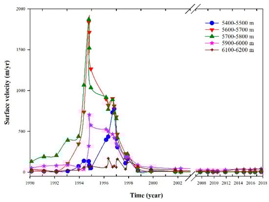 In addition, the glacier velocity changes from 1990 to 2020 at different elevations are shown in Figure 7. Five elevation segments were selected to survey the characteristics of the glacier velocity with time at different elevations. The velocities shown in Figure 7 are the average velocity in the 100 m interval of each elevation segment. It can be found that the glacier velocity in the ablation area (5700–5800 m a.s.l. interval) and near the ELA (about 5930 m a.s.l.) increased at first in the 1990s, and then the velocity at the 5600–5700 m a.s.l. and 5400–5500 m a.s.l. intervals increased. The velocity at the 5400–6000 m a.s.l. interval showed an obvious increase from 1994 to 1998, while the velocity at the 6100–6200 m a.s.l. interval showed no significant increase. In addition, the velocity at the 5900–6000 m a.s.l. interval, which is close to the ELA, was the highest during 1998–2020 (Figure 7), which is in line with the laws of glacier movement.