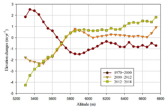 Glacier surface elevation changes versus altitude over the Chongce Glacier during the periods of 1970–2000, 2000–2012, and 2012–2018.