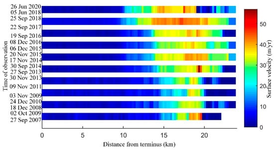 Evolution of surface velocity along with the longitudinal profile (see Figure 1) from 2007 to 2020.