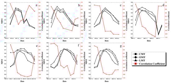 Time-series ((a–g), 1994–2006) for NDVI and correlation coefficient (p < 0.05) between yield and NDVI.