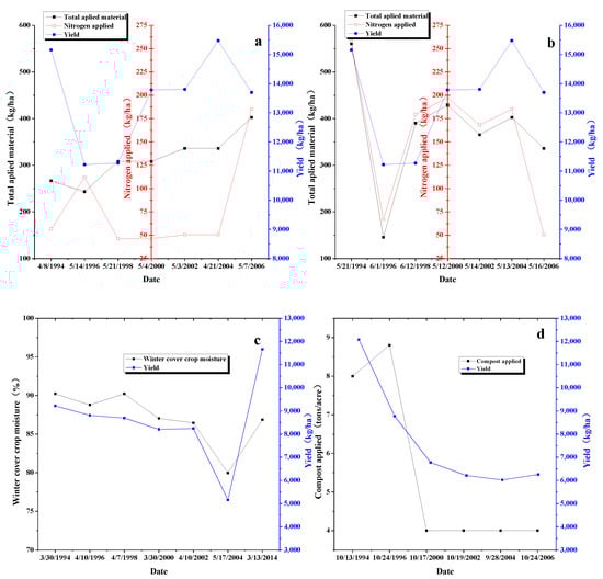 Yield and fertilizer curve for different systems from 1994–2006. (a,b), CMT: mineral fertilizer (total applied fertilizer and nitrogen applied); (a): base fertilizer; (b): top dressing. (c), LMT: winter cover crop (WCC) moisture. (d), OMT: compost applied.