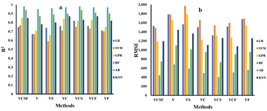 R2 (a), RMSE (b) of six models for maize at the plot scale in different data combinations (V: VIs; VS: VIs + soil; VC: VIs + climate; VIs + climate + soil; VF: VIs + fertilizer; VCS: VIs + climate + soil; VCSF: VIs + climate + soil + fertilizer).