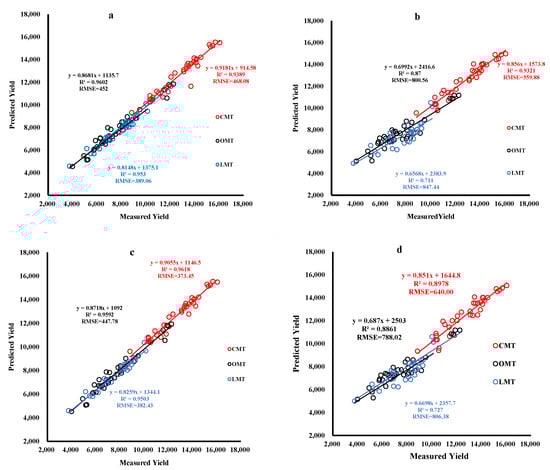 In this study, three systems in RRSAF were separated, namely “CMT”, “LMT”, and “OMT”. We also found that the accuracy of yield prediction varied across different systems (Figure 6). The importance of VIs is weaker than putting the three data systems together to evaluate the different farming systems (Figure 7a). Fertilizer and climate factors can provide more information for more accurate yield prediction (Figure 7b–d). Additionally, we found that the relative importance of TMAX is greater than other variables (Figure 7b) in CMT. Within a certain fertilizer and range of temperatures, an increase of temperature enhances respiration in crops, and the energy that is generated increases, as is the absorption of nutrients and the synthesis and accumulation of organic nutrients. It was also found that crop yields increase with an increase of TMIN and PRE in OMT, which is mainly due to the increasing ground humidity, which benefits the effect of organic fertilizer. LMT was the most affected by WCC in terms of soil nutrients and microorganisms; the decomposition of WCC can not only increase the content of organic matter and activate soil nutrients but can also provide nutrients for later crops to absorb [13].