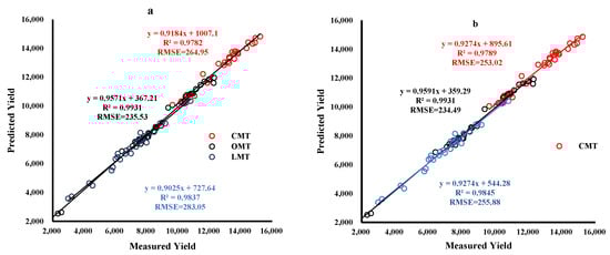 Based on the trained RF and AB models in last section, the RRSAF yields were predicted, and we forecasted the different systems separately. The scatter diagrams of the predicted and measured yields of the models in different systems from 1994 to 2006 in even years are shown in Figure 5. We found that the predicted and measured yields showed a good linear fit, with a R2 of above 0.87. Such results indicated that the two ML models can predict the maize yield at the plot level with higher accuracy and RF > AB. Although all of the predicted yields were close to the measured yields, consistent underestimations were found for LMT and OMT and both VCS and VCSF for the two models, especially for the AB model. In the next section analyzing the different systems, we used the RF model to predicted the maize yield for different systems in odd years.