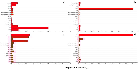 Feature importance values for the 15 variables from the random forest model in each system. ((a), all systems together: fertilizer 1 for total applied material + WCC+ Compost, fertilizer 2 nitrogen + WCC + compost; (b), CMT; (c), OMT; (d), LMT).