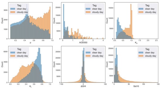 As illustrated in Section 2.2, there are numbers of the quantities used by the CSDsky methods to classify clear and cloudy skies. Though ML specializes in big data with multiply features, huge consumption of computer resources should also be considered. Meanwhile, accurate calculation of clear-sky irradiance needs many parameters; however, many ground sites may provide only irradiance measurements due to the limited equipment. To select the input feature with more generality and accelerate computing, μ and four GHI-related features, including Kd, Kt, GHI difference in adjacent minutes (ΔGHI), and the standard deviation of GHI within 10 min period (Std10), are used to detect clear and cloudy skies. It should be noted that DHI as an early warning signal for potential clouds is a good index to classify sky conditions [7]. Therefore, we select Kd as an agent of DHI (Figure 3). Generally, Kd and Kt are the sign of the influence of atmosphere and cloud on solar radiation, and ΔGHI and Std10 show the temporal variation of GHI. The histogram of input features under clear and cloudy conditions in 2005 is shown in Figure 3. All the variables are normalized to the range of 0–1 by Equation (1); x represents input features.