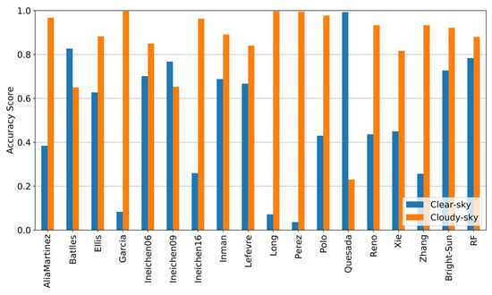 The accuracy score of CSDsky methods and the RF CSD model under clear (blue bar) and cloudy (orange bar) conditions.