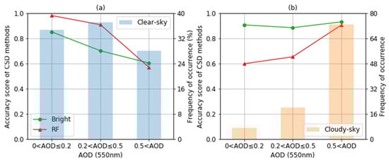 Accuracy score of the Bright-Sun (the green line) and RF CSD model (the red line) under clear-sky (a) and cloudy-sky (b) conditions, and the frequency of occurrence for each AOD background.