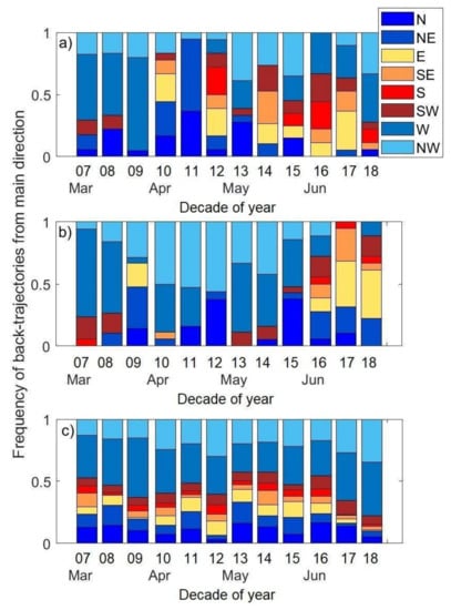 Advection of air pollution was assessed on the basis of wind direction in Warsaw at 0.5 km derived from a 96-h back-trajectory from the HYSPLIT model (Figure 2). Wind directions were further averaged to decadal estimates for 2019 and 2020 and for the 2010–2019 reference period. Comparison of data from 2019 and 2020 in reference to long-term means shows some significant anomalies. For example, in April and at the beginning of May (2020), transport from NW and W dominated and advection from this direction usually brings clean Atlantic air masses to Central Europe. In contrast, during the same period in 2019 (Figure 2a), more frequent transport from S, SE and E was observed; however, between 11 and 20 April and between 1 and 10 May (2019) the circulation changed to N.
