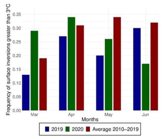 Frequency of surface inversions (temperature gradient greater than 3 °C/100 m) obtained from radiosonde launches at Legionowo weather station 25 km from Warsaw. The blue, red, and orange bars correspond to the springs of 2019, 2020, and to the reference period 2010–2019.