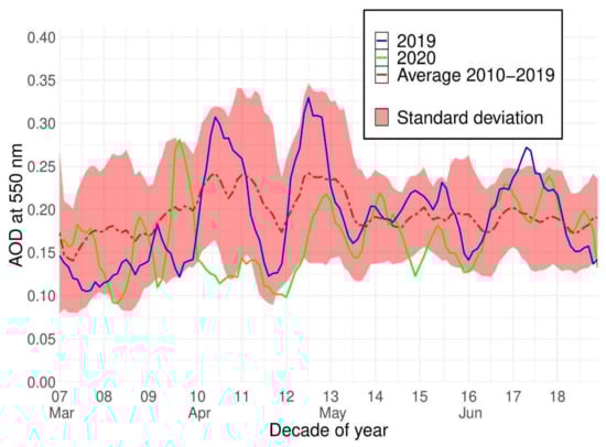 The main drivers for AOD reduction in 2020 with respect to the 2010–2019 average were sulphates (−18%), mineral dust (−16%) and organic carbon (−15%), black carbon (−8%) while sea salt increased by 18% (Table 2). This indicates the advection of clear atlantic air masses from NW and W which dominated Poland in April–May 2020 (Figure 2b). The same reduction in AOD at 500 nm in spring 2020 was observed at the background AERONET station located at Strzyzow far from main roads, industrial and domestic heating emissions. In this respect, AOD during April was about 50% of the 2010–2019 mean (Figure 5). Unfortunately, due to a sun photometer calibration issue, data from 2019 are not available in March and April. Mean AODs from March to June are 0.14, 0.23, 0.21, for 2020, 2019 and the 2010–2019 average, respectively. Ultimately, it has to be stated that the impact of COVID-19 lockdown on columnar AOD, induced by the reduction in vehicle traffic, is expected to be marginal across Poland. This conclusion can be drawn from the study of Zawadzka et al. [] where it was proven that the variability in AOD during spring and summer in Warsaw is rather small (0.01–0.02 at 500 nm) and that the differences between the city center and rural areas are less than 10–15%. Only during very slow advection of air masses coinciding with a temperature inversion does vehicle traffic emission increase the difference.