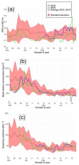 To better understand the reason for reduction in AOD in 2020, the surface black carbon (eBC) concentration from AE-31 aethalometer and the aerosol scattering coefficient from Aurora 4000 nephelometer were analysed at the Strzyzow background station. Both instruments recorded lower measurements in the middle of April 2020 in comparison to the same period in 2019 and the 2010–2019 mean. However, during the end of March and the beginning of April, values in 2020 were close to 2010–2019 means. For eBC there was a significant drop in values in the first half of March 2019 and 2020 compared to the 2010–2019 mean. This can be partly explained by the reduction in emissions from heating systems (2–3 °C air temperature anomaly) but also by the transport of relatively clean air masses (Figure 2). On the other hand, it is less likely that reduction of eBC in 2020 is due to COVID-19 restriction, because Strzyzow station is localized in a large distance to road traffic. The mean eBC for spring (March–June) was 641 ng/m3, 701 ng/m3, and 826 ng/m3, respectively for the 2020, 2019 and 2010–2019 means. Temporal variability of the aerosol scattering coefficient is similar to eBC. Due to instrument calibration issues, these data are not available in March 2020 and in March–April of 2019. Based on the available data, we estimated the mean scattering coefficient (during March–June): for 2020 (57.5 mm−1) slightly lower than for 2019 (60.3 mm−1) and for long-term data (60.0 mm−1).