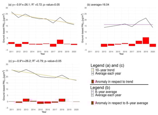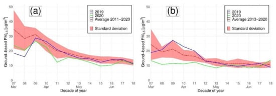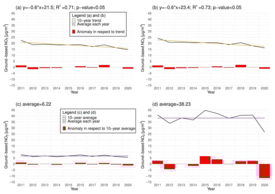 - annual averages from the 7 to 18 decade (March–June), which were further used to derive linear temporal trends. If a temporal trend was statistically significant according to a t-test [], it was used to derive annual anomalies of PM2.5 and NO2 concentrations. On the contrary, if the temporal trend was statistically insignificant, then a multi-annual average was used to compute annual anomalies.