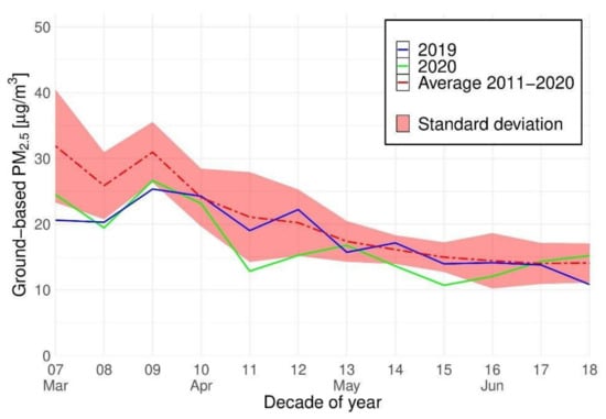 Decadal mean PM2.5 concentrations in 2020 for urban areas are almost within a single standard deviation from the 2011–2020 average. Consequently, it is hard to confirm and quantify the direct impact of the COVID-19 lockdown on PM2.5 concentrations beyond doubt.
