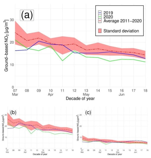 This is noticeable in Figure 9b, where the mean decadal ground-based NO2 concentration for urban stations is significantly below any single standard deviation from the 2011–2020 mean decadal value. On the contrary, background (non-built-up) stations followed the 10-year mean decadal NO2 concentrations more closely (within a single standard deviation). Dissimilarity of patterns between urban and background (non-built-up) stations may indicate that there was an additional factor (i.e., COVID-19 lockdown) apart from meteorological conditions that affected the NO2 concentration in Poland during spring 2020. In this respect, the largest differences from the 10-year average for urban stations were observed in the 11th decade (−36%) during the most stringent lockdown period (Figure 9b). Nevertheless, significant reductions in a range of 20–30% continued throughout the spring 2020.