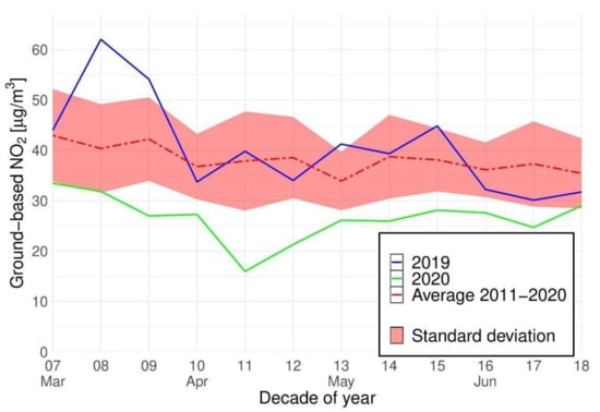 These differences were even more pronounced for stations located in Warsaw during the 11th decade (−58%) and 12th decade (−45%) of 2020. Overall, NO2 concentrations in Warsaw during spring 2020 were reduced by 30% as compared to the 2011–2020 average and by 32% as compared to 2019 (Figure 10). Across the whole of Poland, NO2 concentrations in spring 2020 were 21% lower than the 2011–2020 average and 10% lower than in 2019 (Figure 9a). Gradual lifting of COVID-19-related restrictions resulted in a 52% increase in vehicle traffic between April and May 2020 and a 19% increase between May and June [,]. This in turn corresponds well with the increase of NO2 concentrations in Warsaw between 11th and 18th decades (Figure 10), but is opposite to the decreasing trend across all urban stations in Poland (Figure 9b). This may indicate that the COVID-19 lockdown in Poland had a significant effect on NO2 concentrations only in large cities with busy traffic.