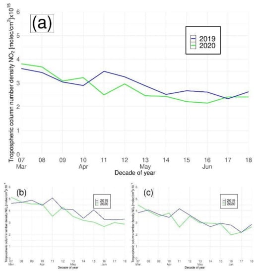 Decade variability of median tropospheric NO2 column number density (molec/cm2·1015) over Poland (a); urban areas in Poland (b); and non-built-up areas in Poland (c); in 2020 (green line) and 2019 (blue line). The X axis corresponds to a decade of the year.