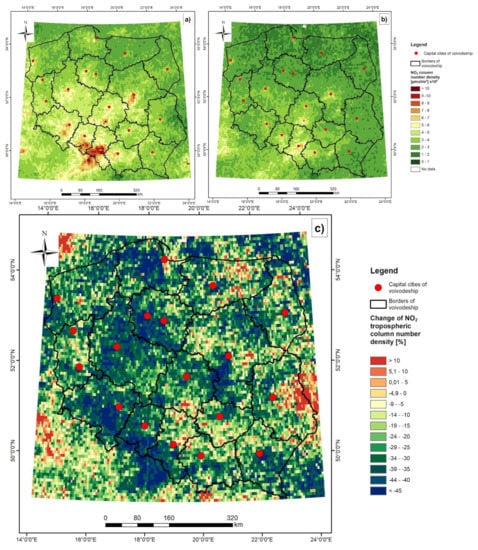 NO2 TVCD (molec/cm2) over Poland during 11th decade of the year: 2019 (a) and 2020 (b). Changes in NO2 TVCD (%) over Poland during the 11th decade (c) (difference of NO2 TVCD during the 11th decade in 2020 (b) with respect to 2019 (a).