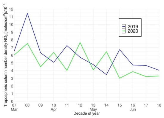 The short time series of Sentinel-5P data (since July 2018) allows a comparison of only two spring seasons without a reference to long-term decadal variabilities. In this respect, NO2 concentrations derived from satellite measurements (Figure 12) reveal a similar decline through the spring season to ground measurements (Figure 9). The agreement between satellite and ground observations is also noticeable for mean differences in NO2 concentrations between the spring seasons in 2019 and 2020. NO2 concentrations derived from Sentinel-5P data were 6% lower in 2020 than in 2019 (Figure 12a) across the whole of Poland, and were 9% lower for urban areas (including Warsaw) and 4% lower for non-built-up areas. Furthermore, a distinct drop of NO2 concentrations during the 11th decade of 2020, which coincides with the introduction of COVID-19-related restrictions, is visible in both datasets for urban and background stations. In this decade, NO2 concentrations were lower in 2020 than in 2019 by 28% across the whole of Poland, by 30% across the urban stations, by 37% across non-built-up areas and by 45% in Warsaw (Figure 13).