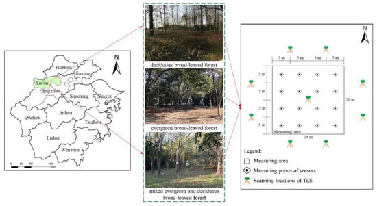 Three typical broad-leaved forests were selected for field observations at Zhejiang Agriculture and Forestry University (119°43′–119°44′E, 30°15′–30°16′N) in Lin’an district: evergreen broad-leaved forest (EBF), deciduous broad-leaved forest (DBF), and mixed evergreen deciduous broad-leaved forest (MBF). The main arbor species in these forests are Cinnamomum camphora, Osmanthus fragrans, and Castanopsis sclerophylla in EBF; Populus simonii and Yulania liliiflora in DBF; and Koelreuteria paniculata, C. camphora, O. fragrans, and Yulania liliiflora in MBF. The standing conditions of these species were consistent, with good growth conditions and without any obvious influence of diseases and insect pests. More details on each forest are shown in Table 1. The measured area of the broad-leaved forests was 20 m × 20 m. Considering the influence of slope and edge effects, we chose sample plots located at a gentle slope and away from the road.