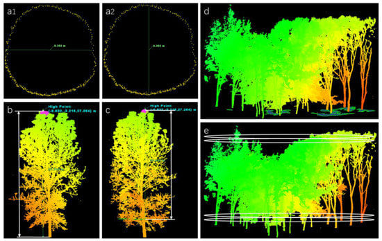 The average DBH of the stand was obtained by calculating the mean values of all trees with transverse and longitudinal diameters at 1.3 m in forests (Figure 4a1,a2) using the point cloud slice-based method []. The distance from the tree base to the crown top is the TH of a single tree (Figure 4b), and the distance from the first branch point of the tree to the top of the crown is the CT of a single tree (Figure 4c). The average TH of all trees in a stand was the average TH of the stand, and the CT was calculated in the same way. Under the orthographic view of Cyclone, the CCA was calculated as the difference between the total plot area and the canopy gap area (Figure 4d).