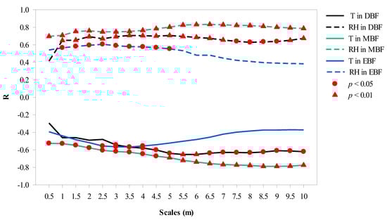 The correlation results between CPI and microclimate factors at 20 canopy projection scales are shown in Figure 7. CPI showed a significant correlation to T and RH between 2.5–4 m in EBF, 3–10 m in DBF, and 0.5–10 m in MBF.