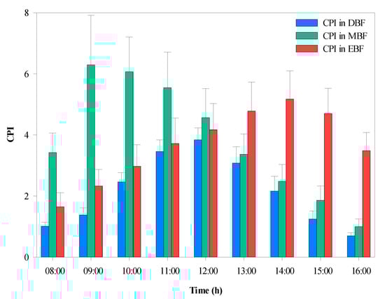 The average CPI was calculated hourly during the daytime, as shown in Figure 8. Statistical analysis indicated that there were significant differences in CPI between the three forest types. The highest CPI (6.29) was observed in MBF, which maintained higher values in the morning compared with that of the EBF, which had higher values in the afternoon. The CPI gradually increased until 12:00, when the peak value occurred in DBF.