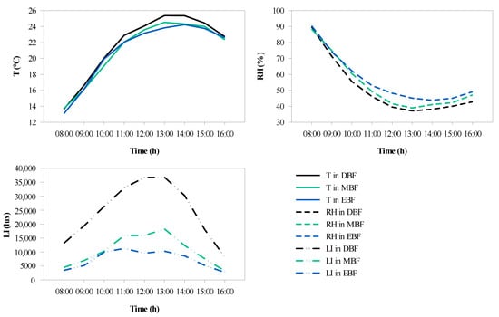 It is well known that T and RH are negatively correlated in forests [,,]. This relationship was confirmed in the present study. The correlations of LI with T and RH at different times of the day indicated that the time required for LI and T to reach a significant correlation differed between forests, which was at 09:00 in DBF, 10:00 in MBF, and 11:00 in EBF. In addition, LI and T reached a significant correlation 1 h earlier than LI and RH in DBF and MBF. In contrast, in EBF, the times were synchronized. This could be explained by the fact that among the three forests, EBF had the largest CC and LAI as well as the largest number of leaves per unit area, causing water loss inside the forest to be slow and humidity to be relatively high at a certain period [], which led to differences in the time for LI and T to reach significant correlations in the different forests. Nonetheless, the question as to which forest (DBF or MBF) first reached a significant correlation between LI and RH needs to be further explored by shortening the time scale.