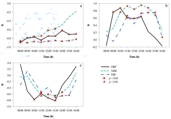 CPI and RH showed a positive correlation between 08:00 and 16:00 (Figure 11b). The longest significant correlation was maintained in DBF (08:00–13:00) and MBF (10:00–15:00), followed by the EBF (11:00–15:00). In the morning, as RH decreased and CPI increased gradually, the coefficient between CPI and RH increased, peaking at 12:00 in DBF (r = 0.70, p < 0.01), MBF (r = 0.802, p < 0.01), and EBF (r = 0.59, p < 0.05). In the afternoon, the effect of canopy projection on the RH became weaker.