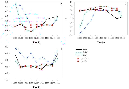 Correlation analyses were performed to elucidate the mutual effects between the microclimate factors in the different broad-leaved forests at different times of the day in autumn, and the results are shown in Figure 10. Between 08:00 and 16:00, there was a significant negative correlation between T and RH (Figure 10a) in EBF (average r = −0.87, p < 0.01) and DBF (average r = −0.76, p < 0.05), and the correlation coefficients remained stable; in contrast, MBF showed a decreasing trend (average r = −0.72, p < 0.05). In addition, the correlation between T and LI (Figure 10b) was significant from 11:00 to 15:00 (except at 12:00) in EBF and significant from 09:00 to 13:00 in DBF, with the longest duration of significant correlation shown in MBF from 10:00 to 15:00. In terms of the correlation between RH and LI (Figure 10c), the time period when RH and LI were significantly correlated was 11:00–15:00 (except at 12:00) in EBF, 10:00–13:00 in DBF, and 11:00–14:00 in MBF.
