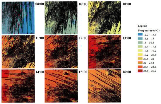 Figure 12 shows the spatial distribution pattern of the effect of canopy projection on T from 08:00 to 16:00 on a scale of 20 m × 20 m. As displayed by the map, the denser the projection, the lower the T is, as indicated by blue. Conversely, the less dense the projection, the redder the color and the higher the T.