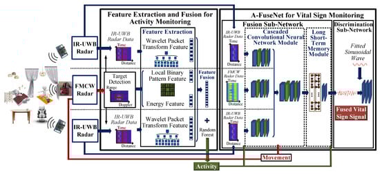 This paper proposes a framework to address these problems, achieving intelligent spatial-temporal information fusion on Frequency Modulated Continuous Wave (FMCW) and Impulse Radio Ultra-Wideband (IR-UWB) radars for indoor activity and vital sign monitoring for moving people. Figure 1 shows the flowchart of the proposed framework, composed by the feature extraction and fusion for activity monitoring, and the A-FuseNet for vital sign monitoring. The main contributions are listed as follows: