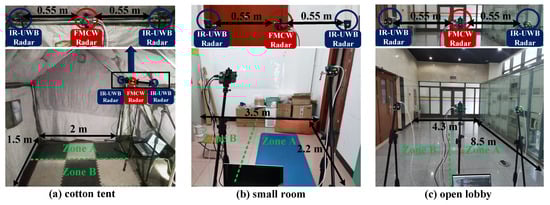 The experimental setup is shown in Figure 2. An FMCW and two IR-UWB radars were employed along a linear baseline at a height of 1.45 m for data collection. The FMCW radar was deployed at the midpoint of two IR-UWB radars, 0.55 m apart from them. In order to validate the performance of the proposed framework, three different indoor environments at Beijing University of Posts and Telecommunications were considered for multi-radar data collection. These indoor environments included: (a) a narrow and confined cotton tent with an area of 1.5 m × 2 m; (b) a 3.5 m × 2.2 m small room with many sundries; and (c) a wide and empty lobby with an area of 4.3 m × 8.5 m, as shown in Figure 2a–c respectively. Participants were required to perform different activities with various body movements in front of three radars. All the radars collected data at 20 frames-per-second. The oximeter with FDA certification served as the reference for vital sign monitoring, and was equipped for each person to record heartbeat rate. These three radars began data collection with multi-thread, and the timestamp was attached to each recorded signal from three radars and the oximeter for data synchronization.