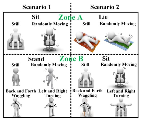 To demonstrate the performance of the proposed framework for activity and vital sign monitoring, two scenarios with 12 conditions were designed for multi-radar data collection. The detecting area was equally divided into two zones A and B. Thus, zones A and B were of equal geometric size, which was 0.75 m × 2 m in the cotton tent, 1.75 m × 2.2 m in the small room, and 2.15 m × 8.5 m in the empty lobby, respectively. Two people performed three different activities with four kinds of body movements in each zone respectively. In scenario 1, as the first column in Figure 3 shows, the people in zone A sat and the other people stood in zone B, with their bodies facing the radars. Scenario 2 involved two people lying down and sitting in zones A and B, respectively, as presented in the second column in Figure 3. In each scenario, the people in zone A kept still or with arms and legs moving randomly, while the other people in zone B performed four different body movements, including keeping still, arms and legs moving randomly, the upper body waggling back and forth, and turning left and right periodically. Eight measurements of different activities and body movements were recorded in each scenario.