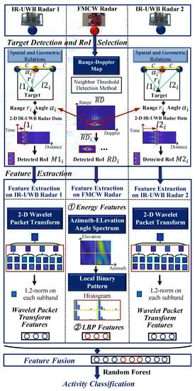 - A novel feature extraction and fusion method is proposed with FMCW and IR-UWB radars for activity monitoring with various body movements, combining global and local spatial-temporal distribution information in 3-D space. For FMCW radar, the energy features of the Range-Doppler map (RDM) are extracted as the global spatial distribution, while the local binary pattern (LBP) features of the azimuth-elevation angle spectrum are proposed to complement the local contrast of angles. In addition, continuously received signals in IR-UWB radar are regarded as a 2-D radar matrix for extracting the spatial-temporal texture features with 2-D wavelet packet transform (WPT). These features are concatenated as a vector and combined with a random forest for activity classification.