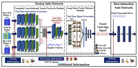 The radar-to-target angles and distances, as well as the distribution of multipaths reflected from the human body, vary among diverse activities. Moreover, the changes in received signals are different in three radars deployed at different observation locations. Thus the activity category obtained from Section 3 was introduced in the fusion sub-network to assist vital sign information extraction for two IR-UWB and the FMCW radars respectively. Furthermore, the additional activity information was also added to the discrimination sub-network to guide and modify the vital sign signal optimization.