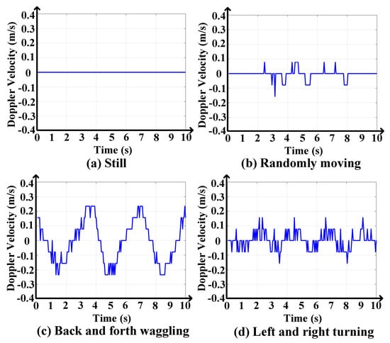 The Doppler velocity trajectories for four different body movements during 10 s of sitting people are illustrated in Figure 6, including staying still, moving randomly, the upper body waggling back and forth periodically, and turning left and right periodically. As Figure 6a shows, the Doppler velocity keeps 0 m/s for people staying still, whereas it fluctuates positively and negatively with body motions in Figure 6b–d. The periodicity of body movements is obviously observed in both back and forth waggling and left and right turning, while the random motion leads to irregular changes on Doppler velocity. Moreover, the variation difference in back-and-forth movement is larger and the trajectory is smoother than that with left-and-right turning, presenting more distinct velocity changes. The Doppler velocity trajectories present the body movement features in dissimilar ways, which provide prior-knowledge of movement status and assist in recovering the heartbeat signal in the condition of different distortion levels and modes. They were introduced as the additional movement information in the fusion sub-network to assist vital sign features recovery and heartbeat signal generation.