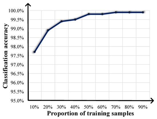 Figure 7 illustrates the classification accuracies with different proportions of training feature samples for activity monitoring based on random forest. It is shown that larger proportions of training samples bring a better performance, and the accuracy tends to be stable when the proportion reaches 70%. The classification accuracy is over 97.5% even with only 10% of training samples, demonstrating the robustness of the proposed feature extraction and fusion.